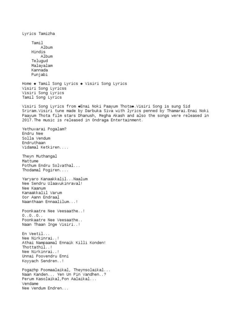 Nee Meendu Vaa Tamil Full Official Song Lyrics Theeviram 2018 Tamil Movie Kadhaippoma lyrics from oh my kadavule is latest tamil song sung by sid sriram.